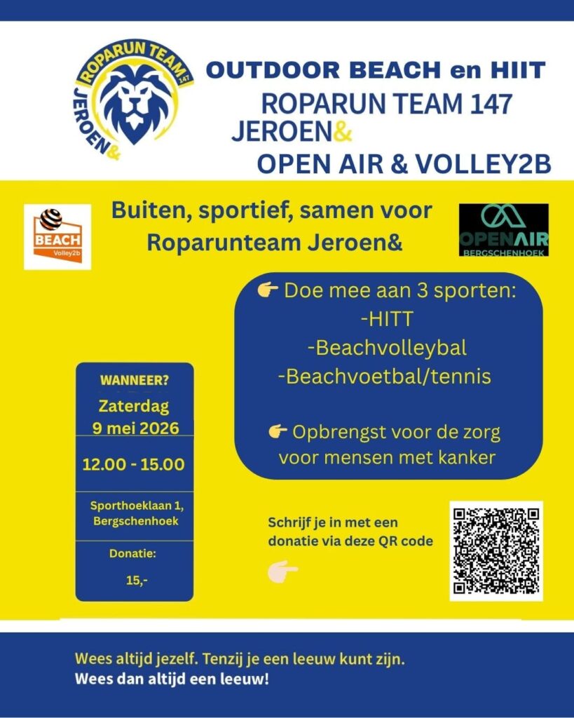 Op 9 mei organiseren we een sportieve en gezellige actie voor Roparun team 147 Jeroen&. Tijdens dit event combineren we BEACH & HIIT, maken we meters voor het goede doel en brengen we samen energie in een initiatief dat écht verschil maakt voor mensen met kanker. Iedereen kan meedoen — leden, ouders, vrienden, collega’s.